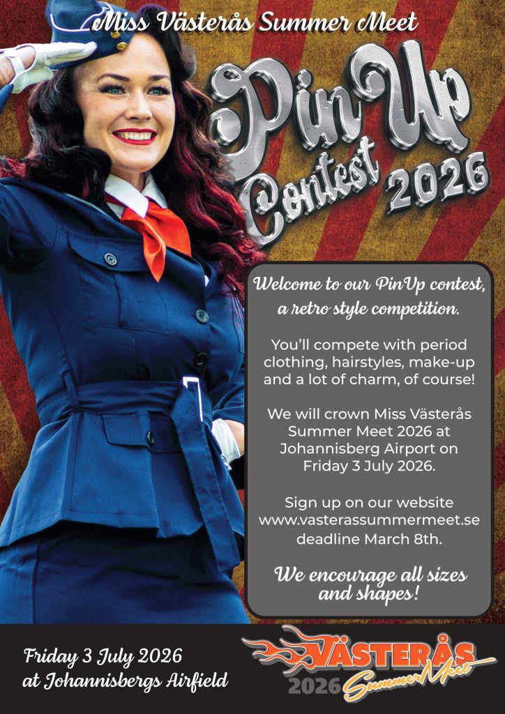 Under Västerås Summer Meet 2026 kommer vi återigen att anordna en Pin Up tävling i retrostil. Här tävlar man med tidsenliga kläder, frisyrer, make up och charm förstås!