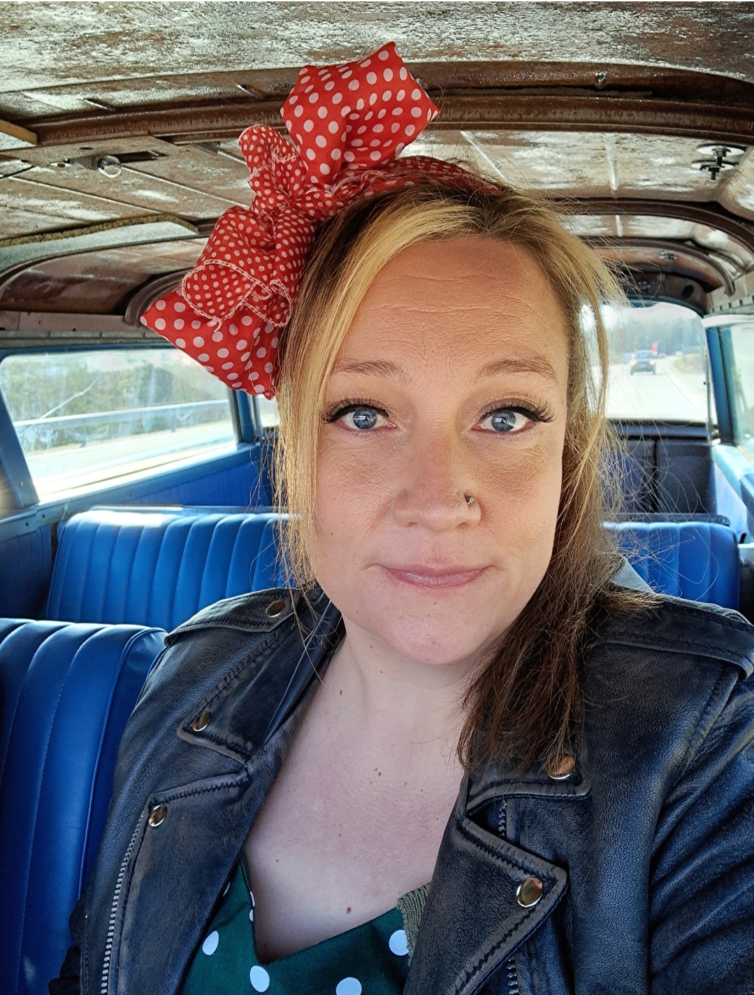 Here’s Miss Sweet Kiss!😍 A real bundle of energy at the ripe old age of 29! In my day job, I work as an excavator operator and get up to mischief with my little son Teodor, who’s two and a half. In the summer, he and I usually drive around in our 1958 Chevrolet.